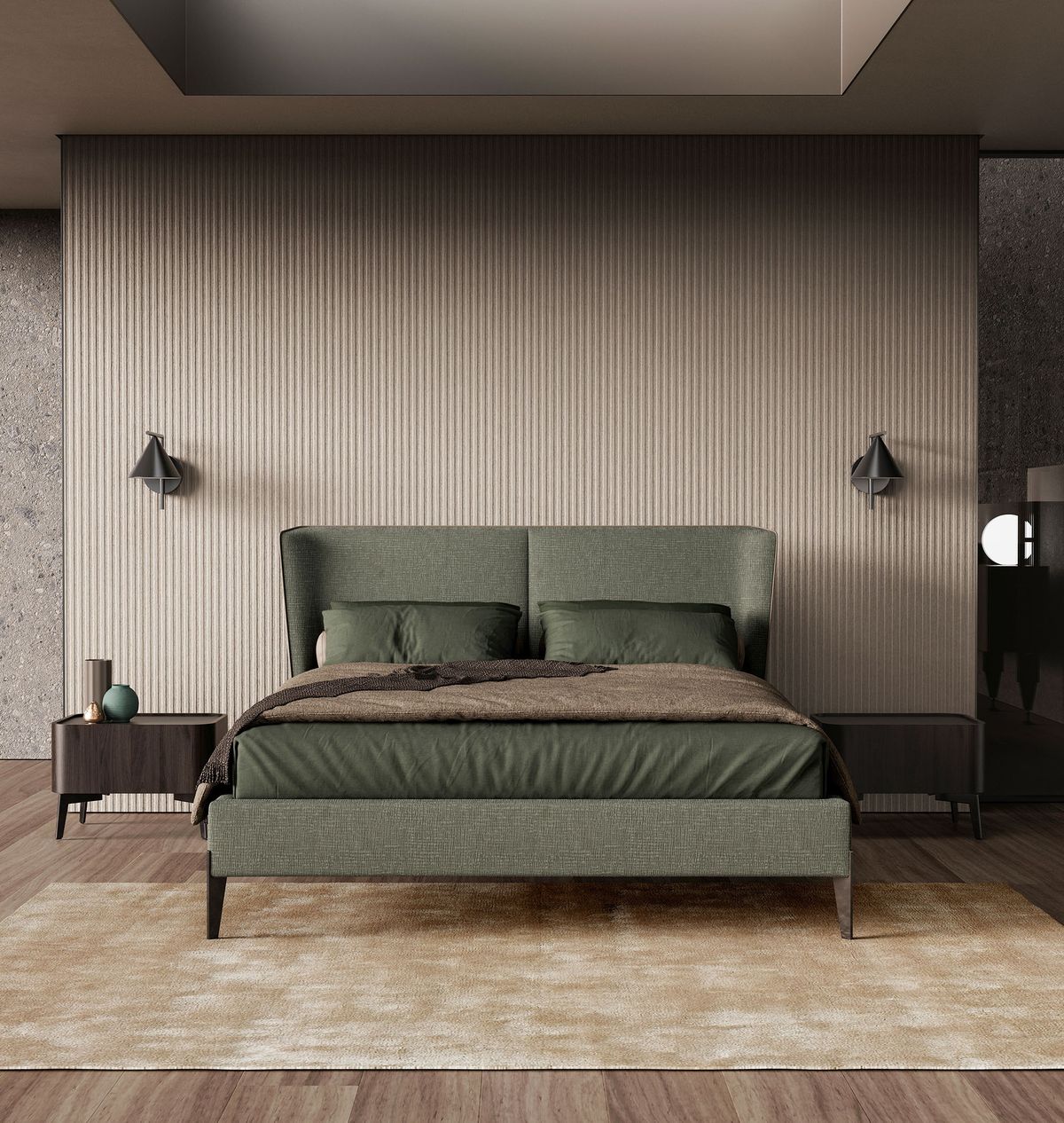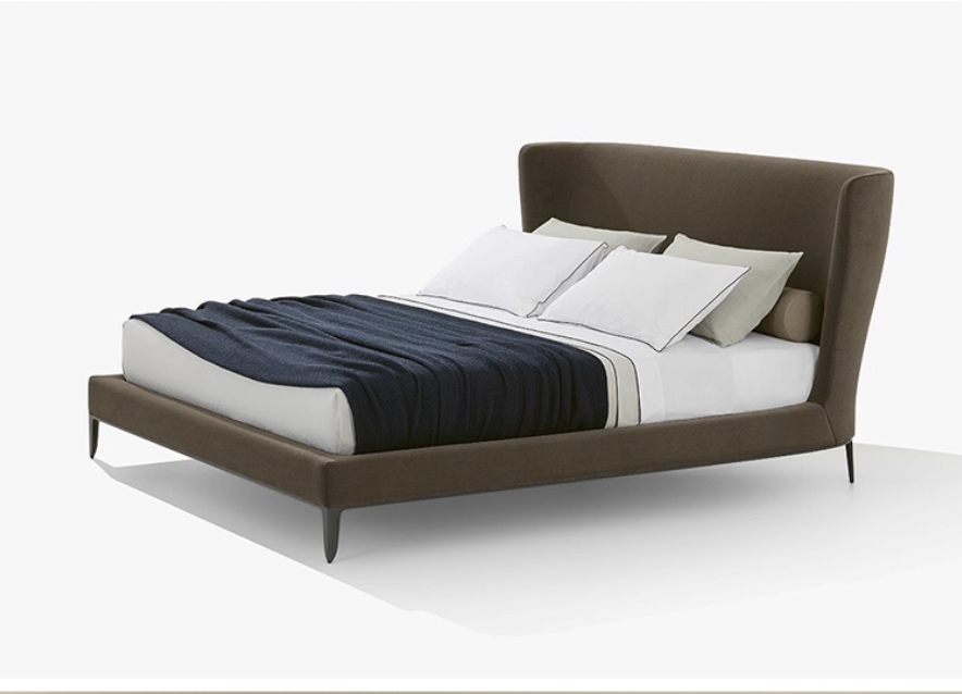 The enveloping headboard features soft lines, complemented by exquisite details such as grosgrain edging.