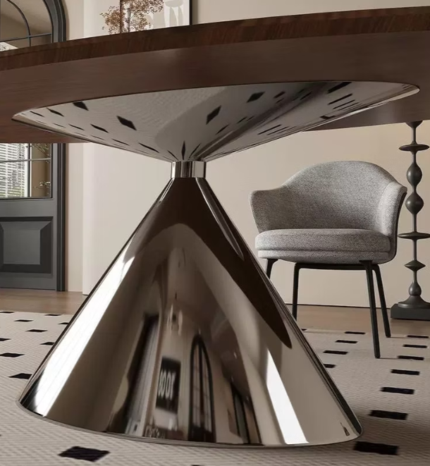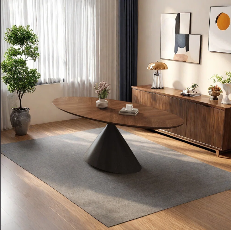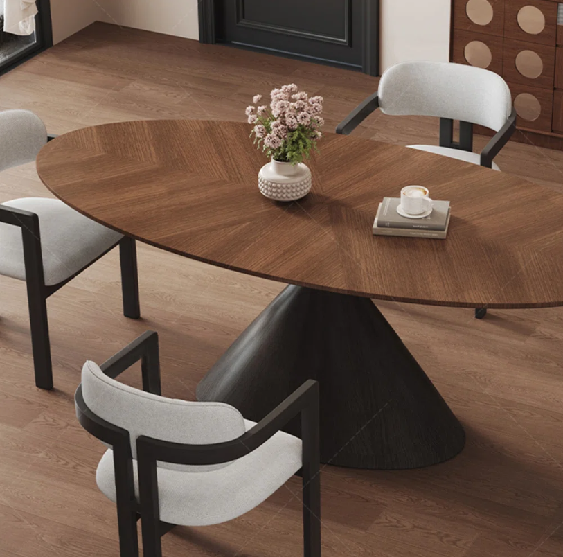 It features an oval tabletop with retro walnut wood grain, and the unique herringbone parquetry technique makes the beauty of the wood texture progress layer by layer, full of texture. Matched with a conical base, it is minimalist yet highly sculptural, providing stable support while injecting an artistic atmosphere into the space.