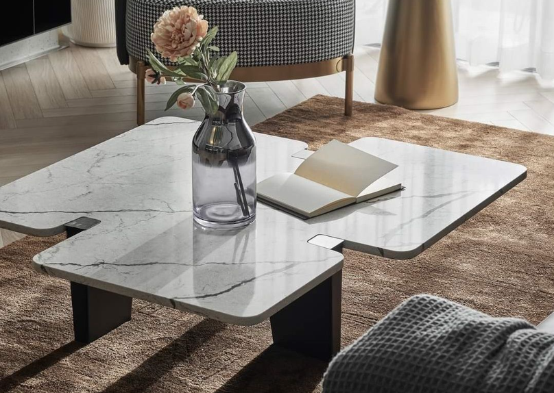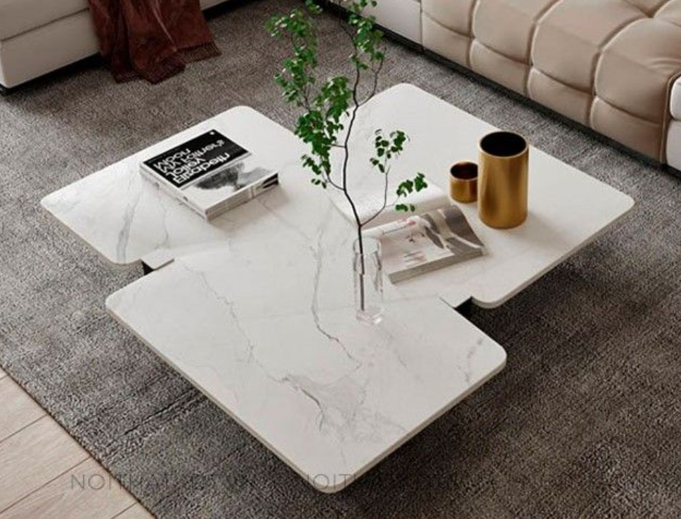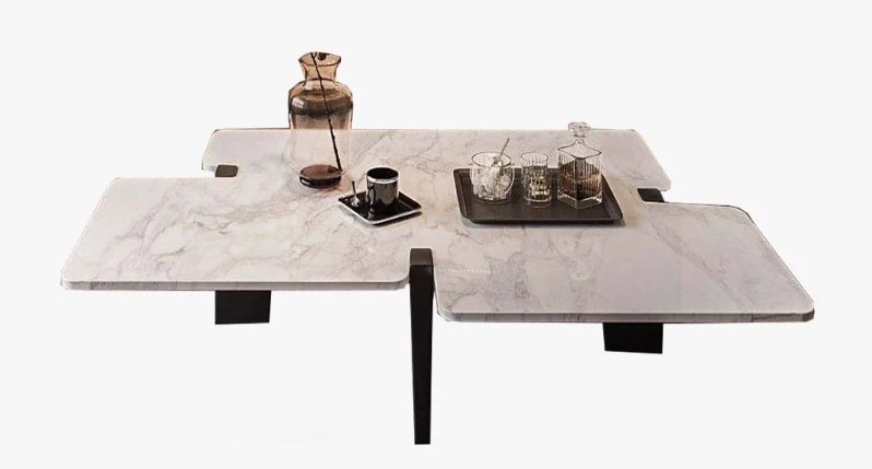 This coffee table features a marble top with natural veining and an irregular shape, paired with sleek black metal legs, showcasing a modern and elegant style.