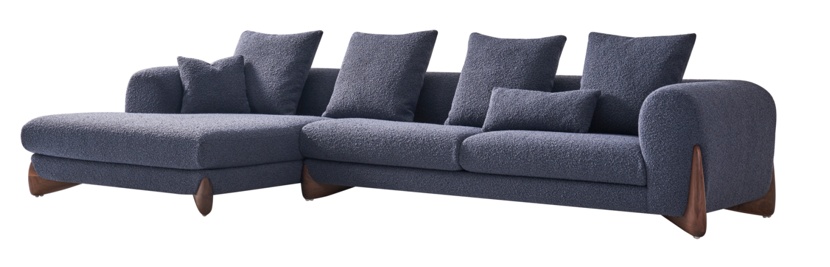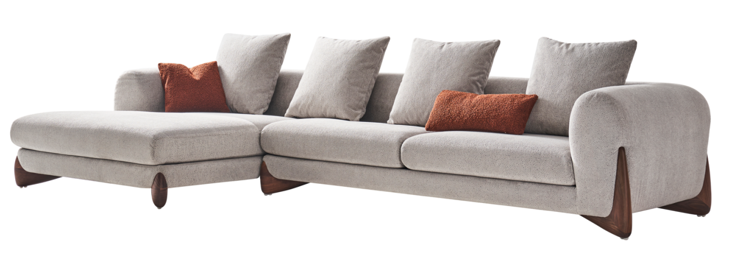 This L-shaped fabric sofa features a light gray main tone with orange cushions and a unique wooden base, boasting a modern and cozy style. The deep seating and soft fabric offer an immersive comfortable experience. Its minimalist design fits various home styles, making it a core piece for relaxation and socializing in the living room.