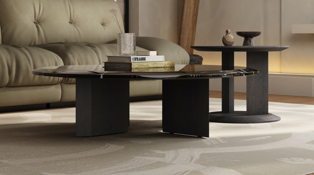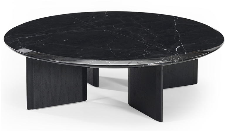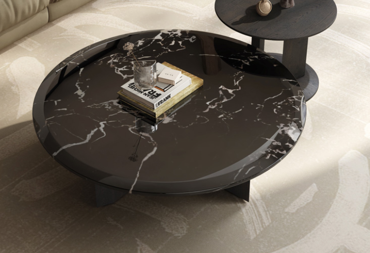 This coffee table features a round black-veined marble top and a black wooden base, exuding minimalist elegance and serving as a texture highlight in modern spaces.