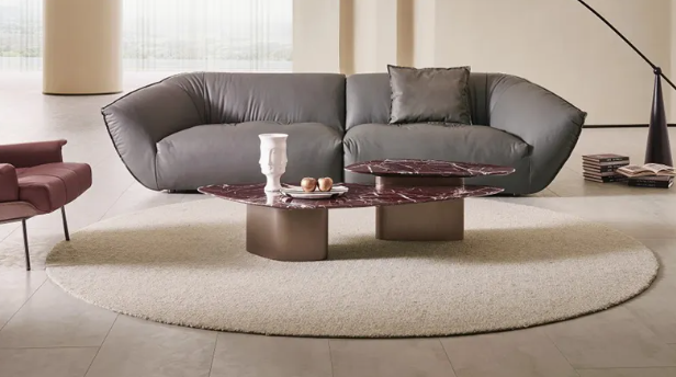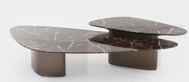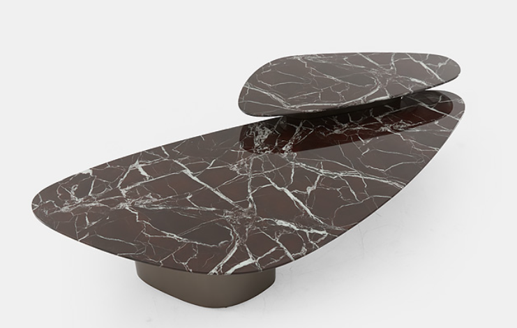This coffee table features a red marble top with white veins and metal-textured bases, and the staggered design of two tables in different sizes showcases a modern and luxurious style.